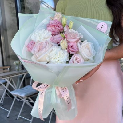 Букет з 11 троянд сорту Mondial та евкаліпту