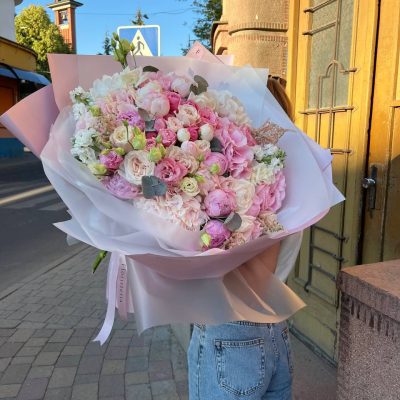 Букет гігант з піоновидних та кущових троянд, гортензій, астільби, еустоми та інших квітів